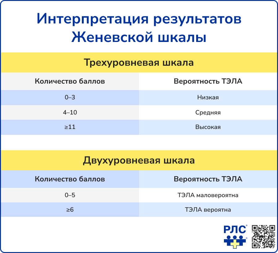 Описание: Женевская шкала используется для оценки клинической вероятности тромбоэмболии легочной артерии (ТЭЛА). Чем больше факторов, предрасполагающих к возникновению тромбоза глубоких вен и ТЭЛА, а также симптомов и признаков, характерных для данных состояний, тем более вероятно наличие легочной эмболии.